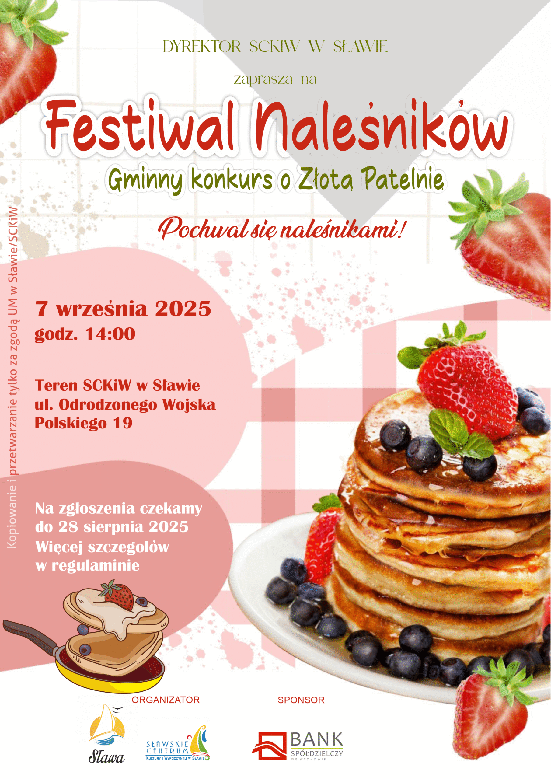 Już we wrześniu na terenie SCKiW odbędzie się Festiwal Naleśników! Gminny konkurs o Złotą Patelnię odbędzie się 7 września 2025 roku o godzinie 14:00. Wszystkich zainteresowanych uczestnictwem prosimy o zgłoszenie się do 28 sierpnia. Należy dostarczyć je osobiście do Domu Kultury w Sławie lub na adres mailowy: dk@sckiw.slawa.pl. Konkurs odbędzie się we dwóch kategoriach: Naleśniki słodkie i wytrawne.
