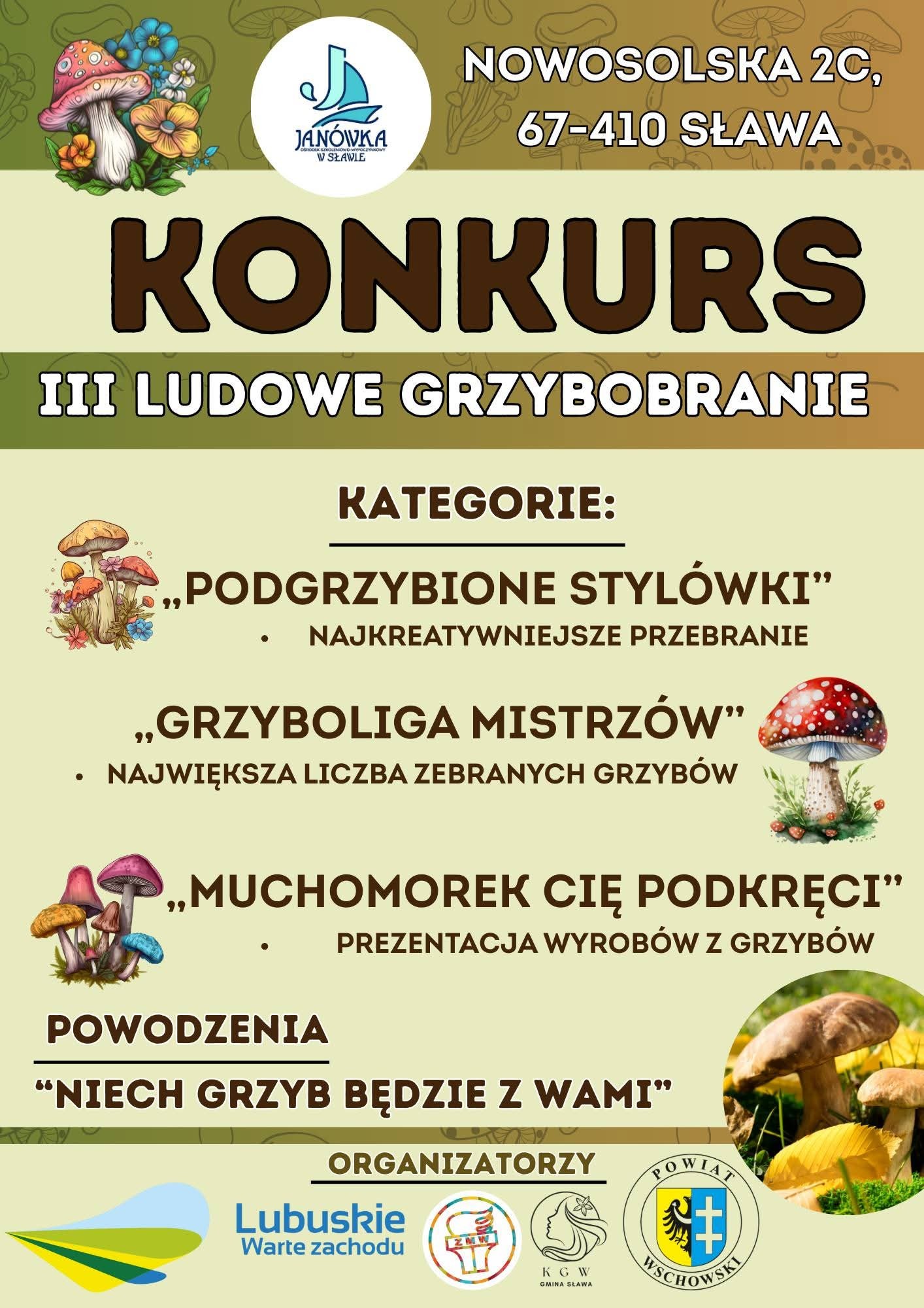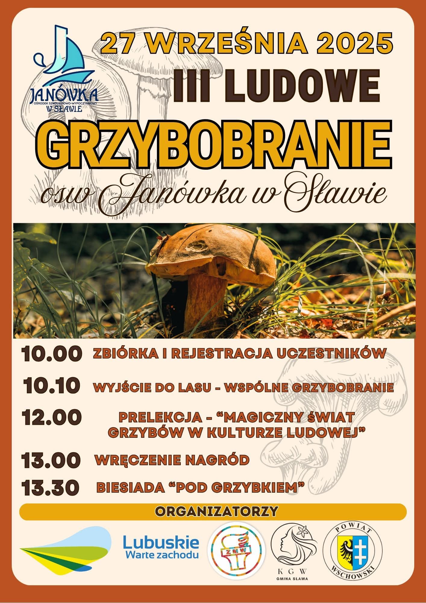 Koło Gospodyń Wiejskich „Pasja” w Radzyniu, Ośrodek Janówka w Sławie oraz Związek Młodzieży Wiejskiej zapraszają na III Ludowe Grzybobranie, które odbędzie się 27 września 2025 roku.