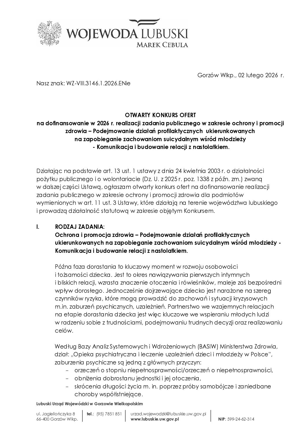 Lubuski Urząd Wojewódzki ogłosił „Konkurs ofert 2026 – Podejmowanie działań profilaktycznych ukierunkowanych na zapobieganie zachowaniom suicydalnym wśród młodzieży – Komunikacja i budowanie relacji z nastolatkiem”.