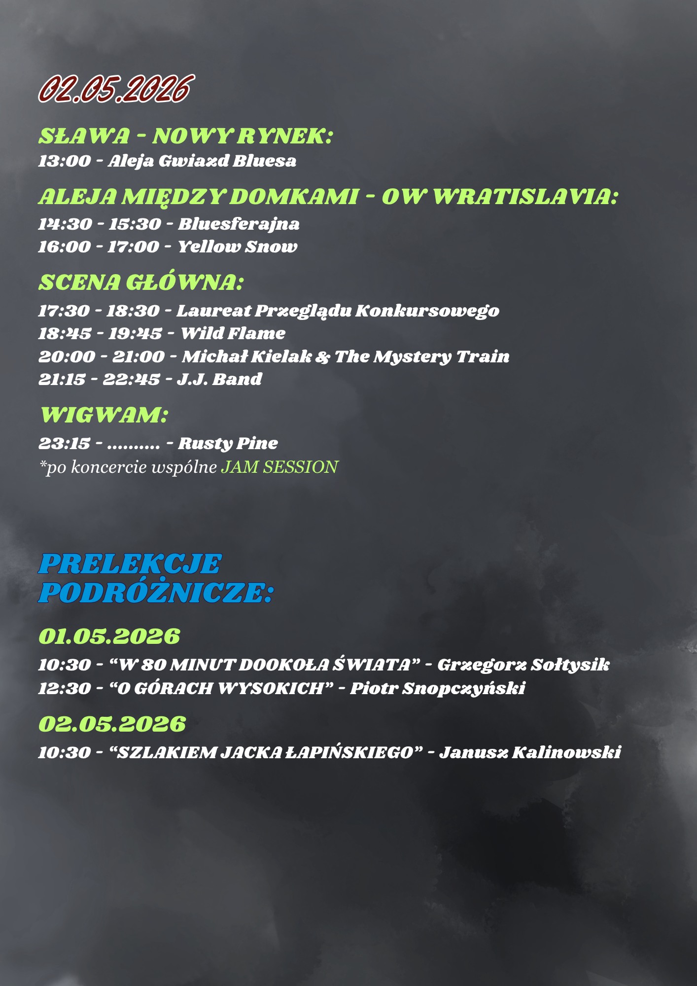 Szczególnym i wzruszającym punktem programu będzie zaplanowany na 1 maja koncert pamięci Jacka Łapińskiego. To właśnie Jacek był twórcą tego festiwalu i nadał mu duszę, którą czuć w Radzyniu do dziś. W koncercie udział weźmie plejada znakomitych muzyków, m.in. Leszek Winder, Jan Gałach, Magda Piskorczyk oraz wielu innych przyjaciół festiwalu. Dla fanów przygód przygotowano cykl Prelekcji Podróżniczych. Swoimi historiami dzielić się będą: