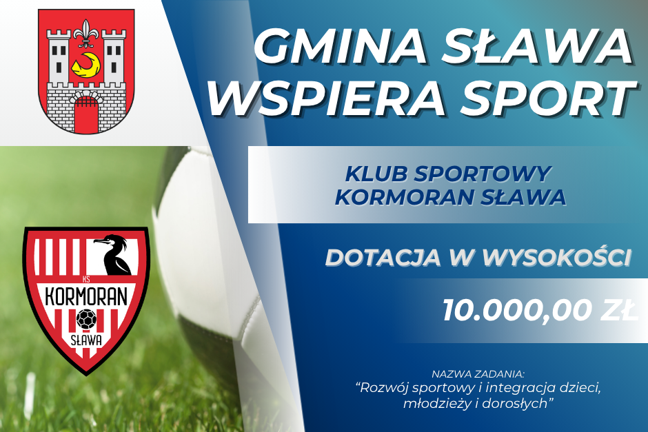 Klub otrzymał kwotę 10.000,00 zł na realizację zadania pt. „Rozwój sportowy i integracja dzieci, młodzieży i dorosłych”. Zadanie, na którego realizację KS „Kormoran” Sława złożył ofertę, obejmuje m.in. prowadzenie systematycznych treningów piłkarskich, udział w meczach i sparingach, a także promocję aktywnego trybu życia i integrację pasjonatów sportu.