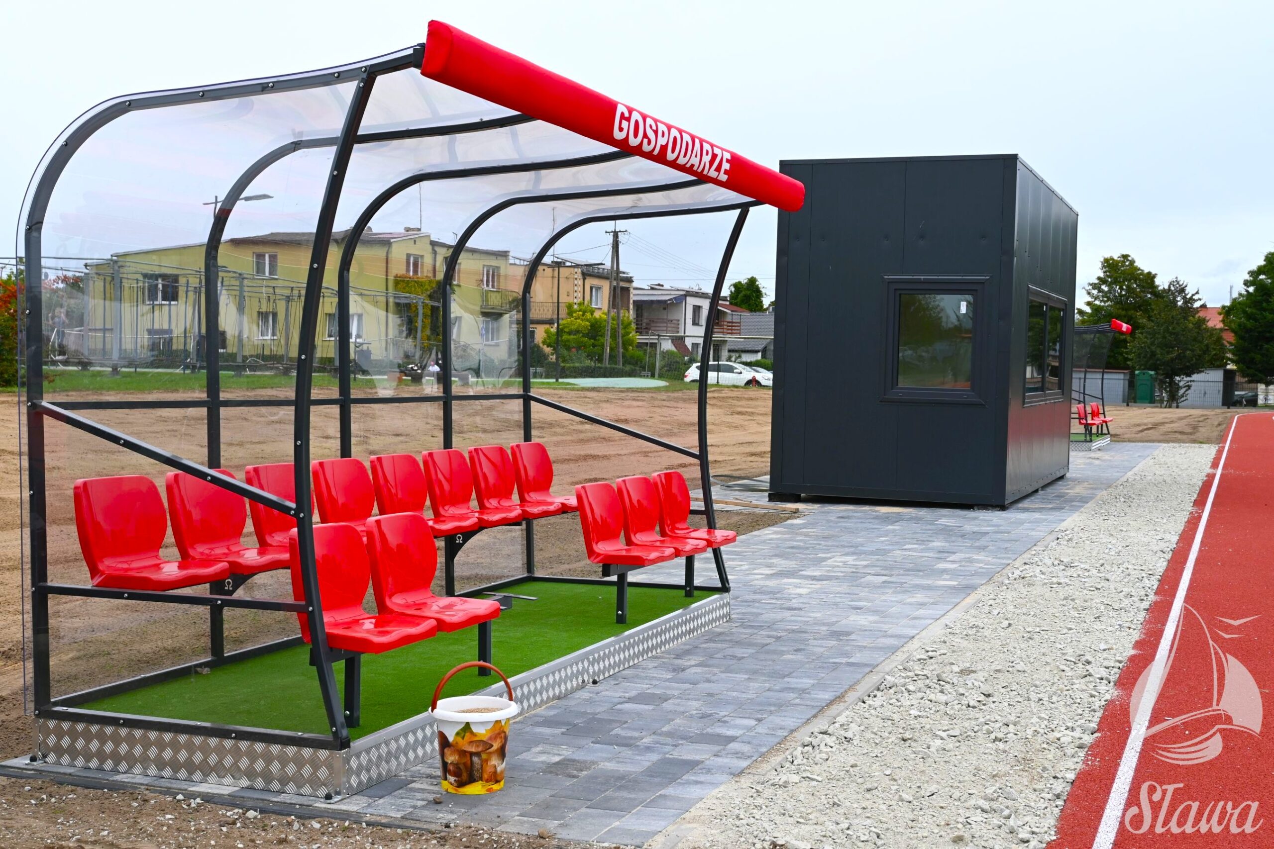 Od południa na mapie obiektu znajduje się budynek szatniowy, do którego przyległe są trybuny, na których niebawem zostanie zamontowanych 314 krzesełek. Wnętrze zaplecza posiada salę konferencyjną, biuro, sanitariaty dla kibiców, cztery szatnie dla zawodników oraz jedną dla sędziów wraz z sanitariatami.