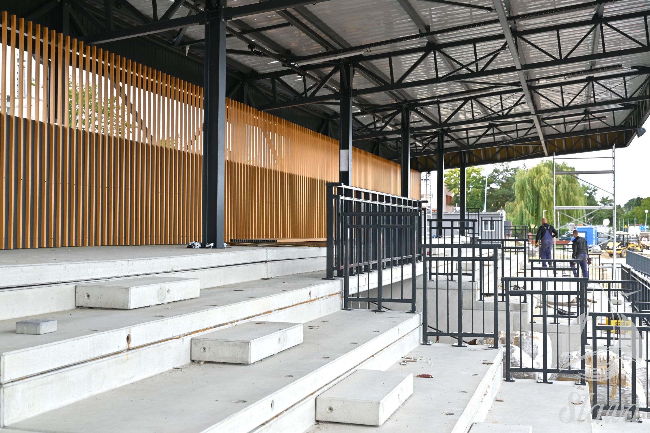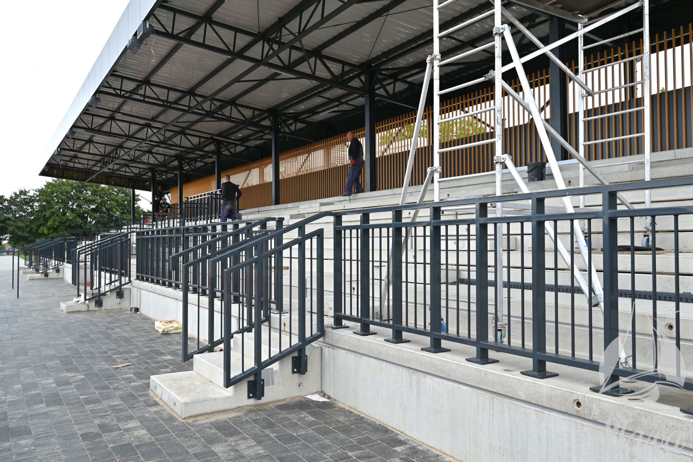 Wewnątrz powstaje pełnowymiarowe boisko do piłki nożnej, ledowe oświetlenie treningowe, a także system nawadniania. Niebawem rozpocznie się montaż bramek oraz piłkochwytów. W otoczeniu od północnej strony pojawiły się już ławki rezerwowych dla gospodarzy oraz gości, a także budka spikera.