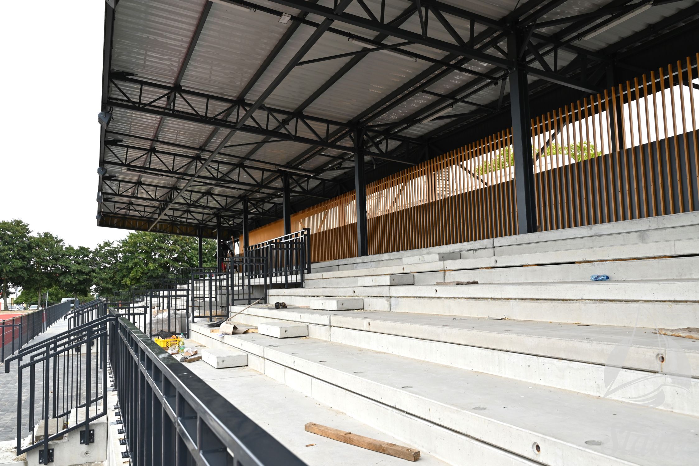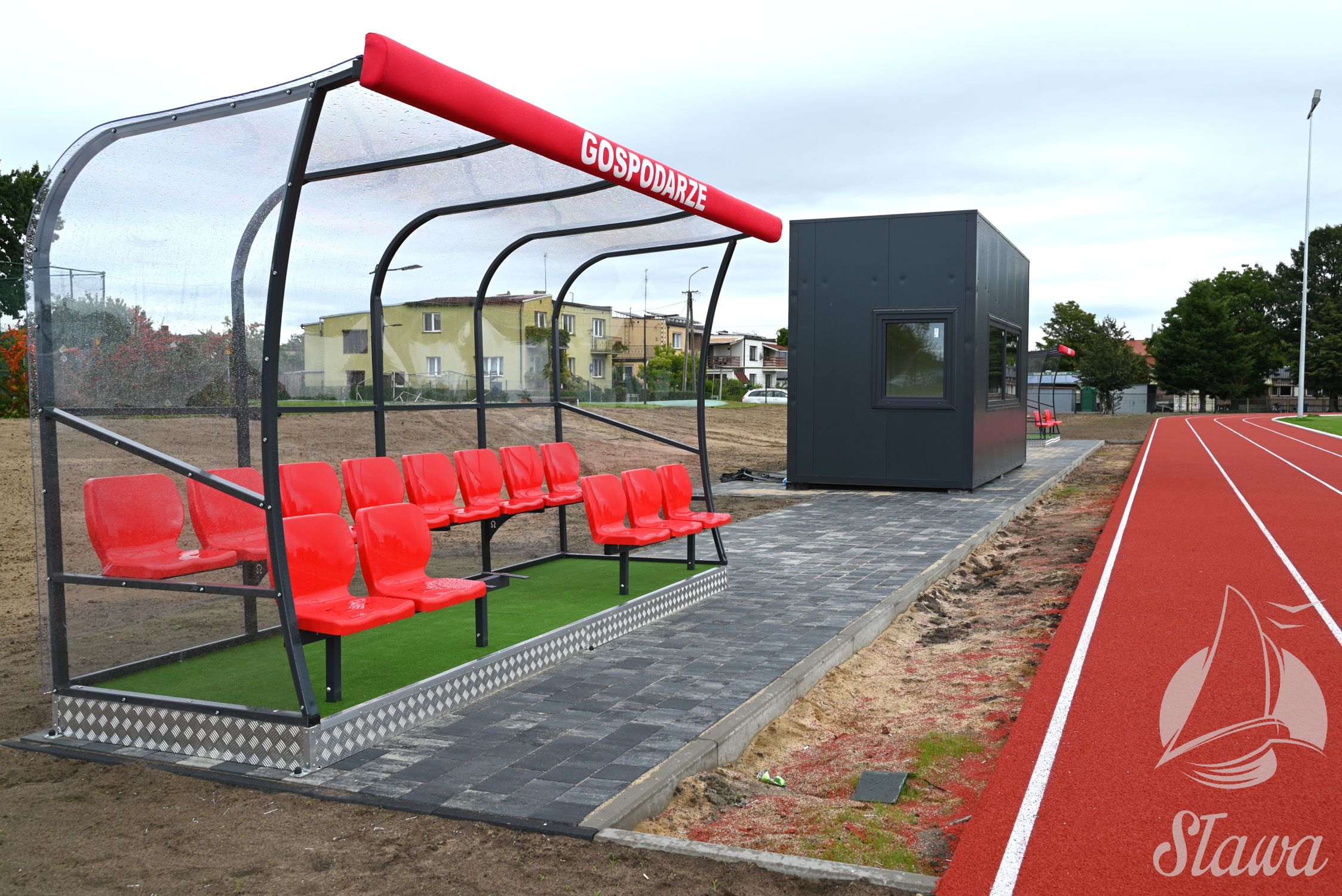 Od południa na mapie obiektu znajduje się budynek szatniowy, do którego przyległe są trybuny, na których niebawem zostanie zamontowanych 314 krzesełek. Wnętrze zaplecza posiada salę konferencyjną, biuro, sanitariaty dla kibiców, cztery szatnie dla zawodników oraz jedną dla sędziów wraz z sanitariatami.