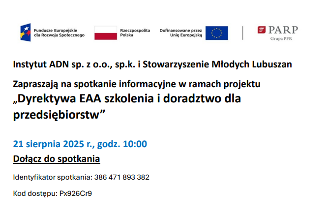 Instytut ADN sp. z o.o., sp.k. i Stowarzyszenie Młodych Lubuszan zapraszają na spotkanie informacyjne w ramach projektu „Dyrektywa EAA szkolenia i doradztwo dla przedsiębiorstw”. Więcej informacji dostępnych na stronie.
