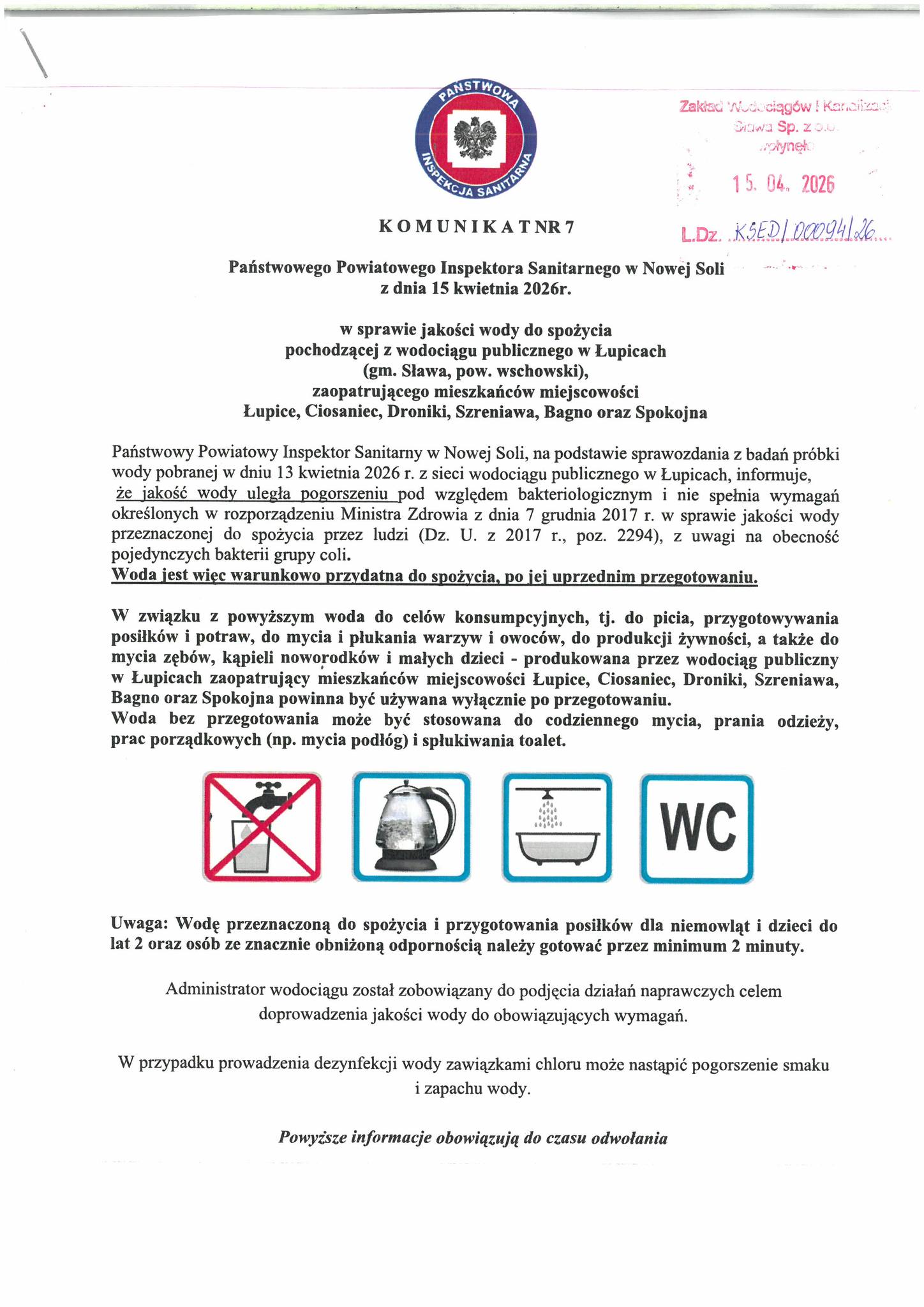 ZWiK Sława informuje mieszkańców miejscowości: Łupice, Ciosaniec, Bagno, Droniki, Spokojna, Szreniawa o pogorszeniu jakości wody. Woda warunkowo przydatna jest do spożycia, po jej uprzednim przegotowaniu.